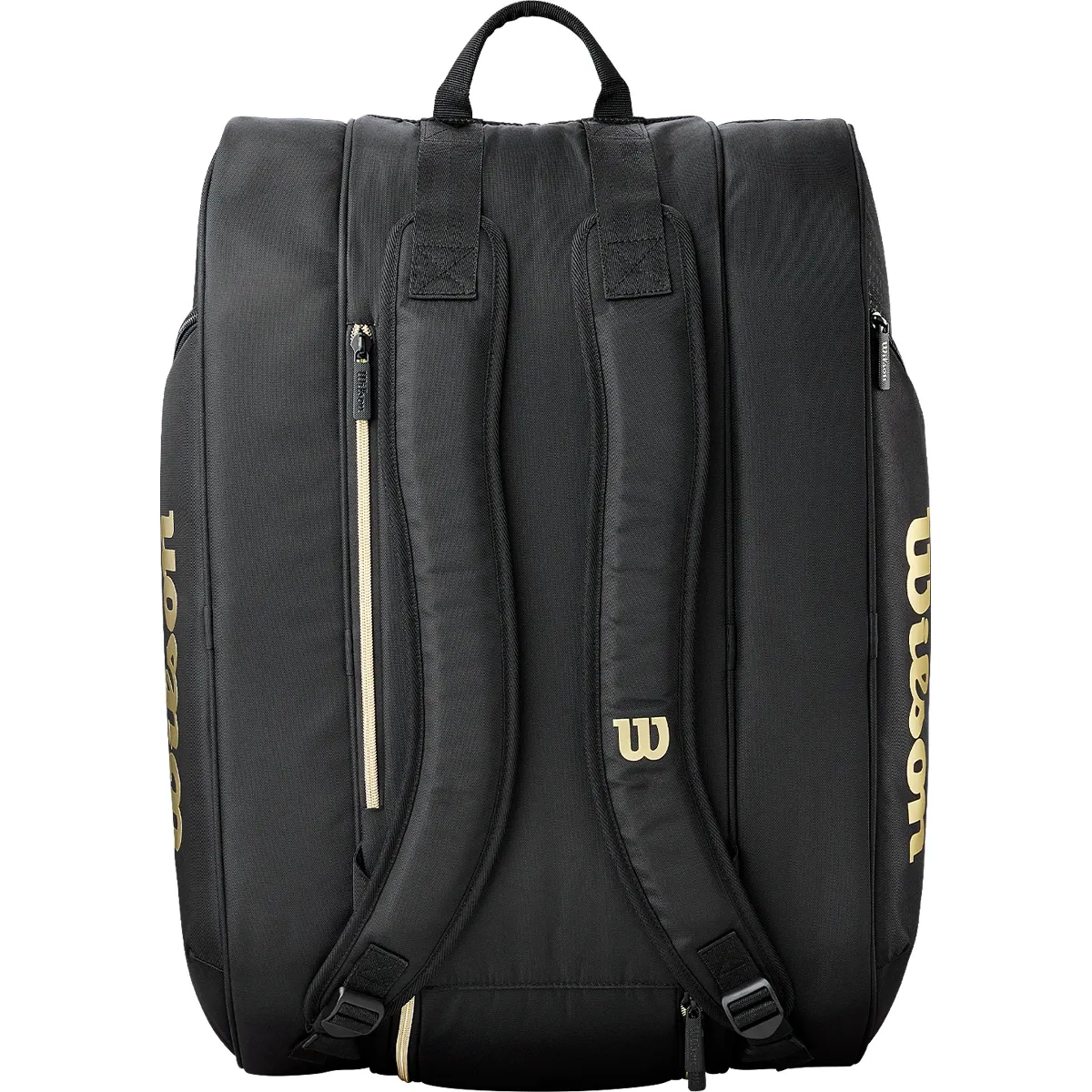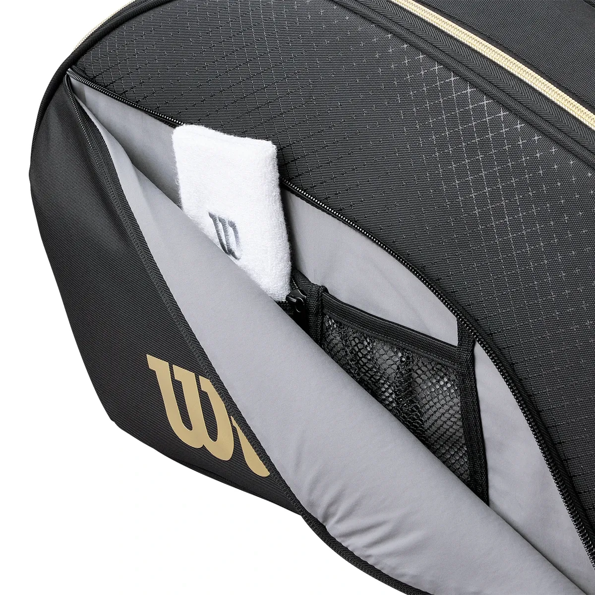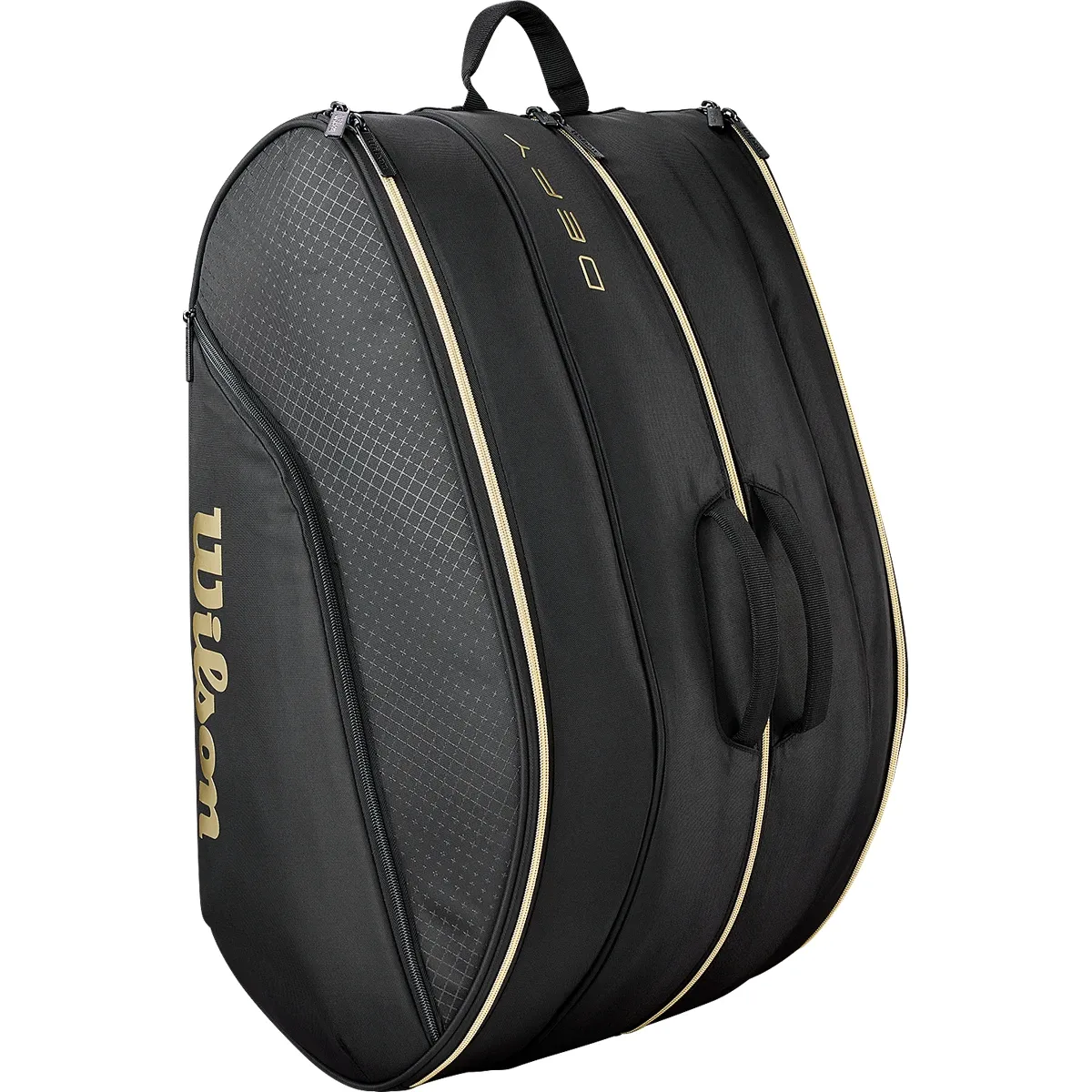 La Wilson Defy V1 nero e oro è la borsa da padel ideale per i giocatori che cercano una borsa funzionale, protettiva ed elegante che li accompagni con stile ed efficienza durante le loro sessioni di gioco.