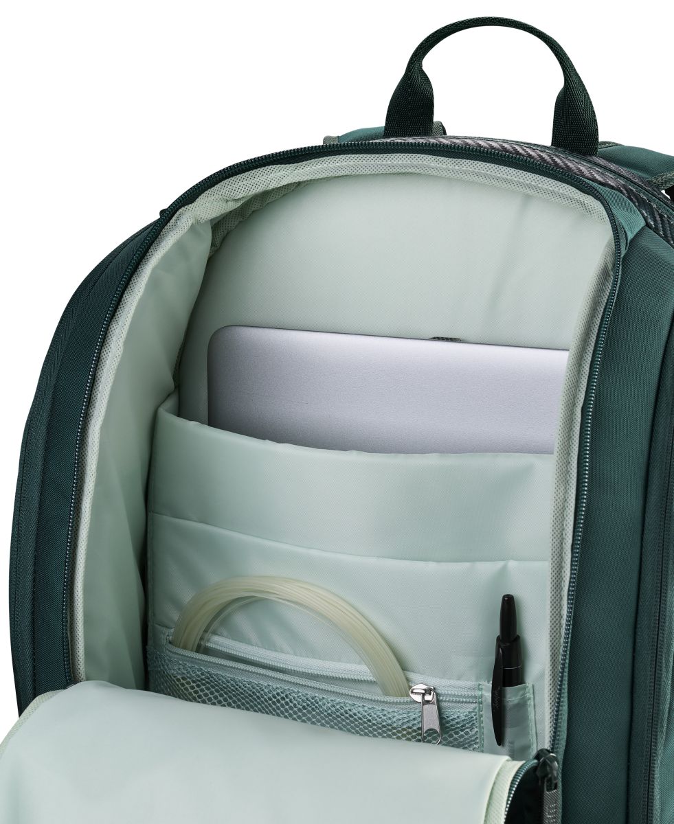 Lo zaino tennis Blade V10 si ispira al design dinamico della racchetta Blade V10 e ne riprende il vivace colore verde. Pensato per i giocatori sempre in movimento, può contenere fino a due racchette in uno scomparto imbottito con cerniere di sicurezza. I molteplici scomparti facilitano l'organizzazione, grazie anche a una custodia imbottita per laptop o tablet e divisori per accessori.